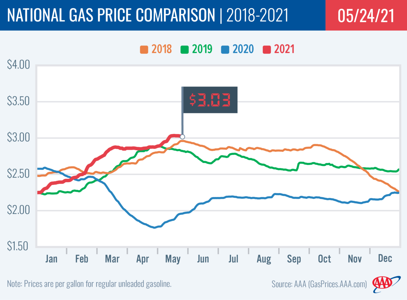 WASHINGTON, D.C. — Motorists hitting the road this week to celebrate the unofficial kick-off to summer will be greeted with the most expensive Memorial Day weekend gas prices since 2014. The national average has stabilized following the Colonial Pipeline cyberattack, but pump prices are likely to fluctuate leading up to the holiday weekend. Over the past weekend, the national gas price average declined a penny to $3.03, the first decrease in two weeks. While barely cheaper on the week, the average is 17 cents more than last month and $1.12 more expensive than last year.