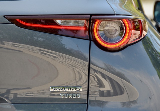 The CX-30 Turbo has minor visual changes to identify it. A turbo badge, black-finished mirror housings, unique alloy wheels and a larger exhaust pipe are the only clues.