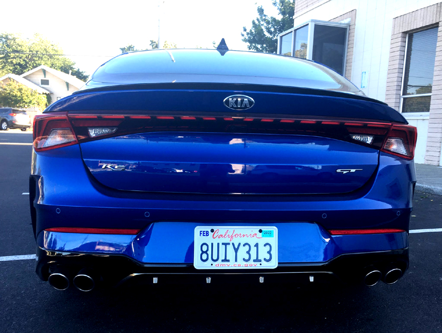 I got into the throttle a couple of times (squawked the front tires once) and it felt fast but I don't do instrumented tests. Kia cites a company named AMCI Testing that found the K5 2.5 GT did 0-60 in 5.8 seconds. Car and Driver found it did it in 5.2 seconds, they estimated that it would top out at 155 mph (I did not match either).