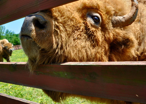 He directed us to the fence near the house and shortly joined us with about 8 big loaves of bread under his arm. He began to holler loudly, repeatedly, while tossing a few slices of bread over the fence. Eddie says the herd follow the dominate female so once she heads our way the rest will follow. The animals were at least a hundred yards away when she, then they, got the message that the boss man was offering treats. In short order, they turned and headed our way, a few trotting but most just snorting and sauntering. Soon they were all at the fence, including a bunch of little ones, milling around and flirting for more bread. I had to scramble to get good shots of them through the fence. The big bull came right to me and stuck his nose through the fence. I tried to pet the side of his head but he would have none of that. He just wanted some bread.