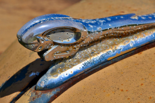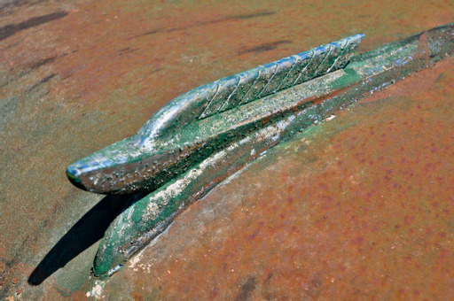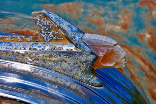 We often speak of ‘the patina of age’ being a natural sort of beauty, like the wrinkles in an old face that represent a life well lived. Even beyond the nostalgic wonder of these old cars, we discover profoundly more drama as we zoom in for closeups of the badges, hood ornaments, styling details and other ephemera. A 1951 Pontiac serves to make the point as its translucent chief’s head hood ornament (one that lit up with the parking lights when new) keeps just a hint of its original amber color but has gained an amazingly complex and artful pattern of cracking within unexpected colors. Next in that row is a Plymouth of similar vintage whose sailing ship hood ornament has the look of a weathered grave stone.