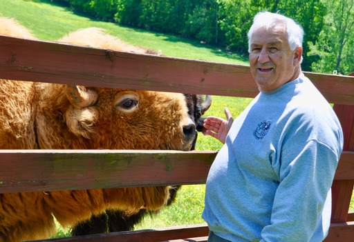 Chatting with the ladies at the local Art Guild while admiring a pastural painting, I shared my bovine art plan and we quickly learned that a substantial herd of buffalo resides nearby at a large ranch, including rare white buffalo, but they couldn’t say where. With a little research we found the Lazy G Ranch a few miles north of Cookeville on Highway 135. Eddie Gaw was puttering in his barn/office surrounded by his collectables – a horse-drawn carriage, wood sculptures, buffalo artifacts, tools and equipment for his eclectic activities. Eddie and his family run about a 150 head of buffalo at any one time for meat and for breeding purposes, though of course, the white ones are not for meat. He raises cutting horses as well with which his kids compete. Eddie, like our Ohio longhorn guys, appreciated our interest goal of gathering photographs of bovine faces.