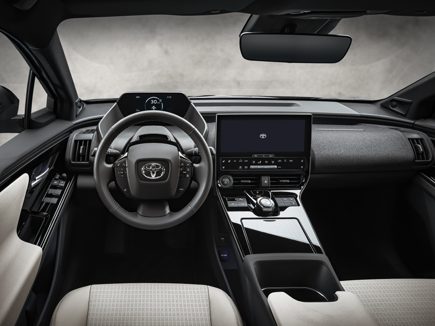 The Toyota bZ4X SUV Concept features a long wheelbase with short overhangs, resulting in a distinctive design with ample interior space. The open-concept interior is designed to enhance driver comfort and confidence on the road. With every detail purposefully engineered, the low position of the instrument panel and the location of the meters above the steering wheel not only help expand the vehicle’s sense of space, but also increase visibility to aid in safe and secure driving.