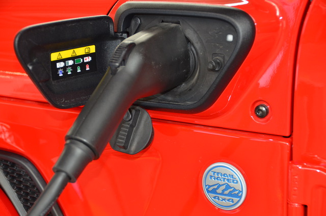 The only give-away that this Wrangler is a PHEV is the charging port located on the driver’s-side just ahead of the windshield.