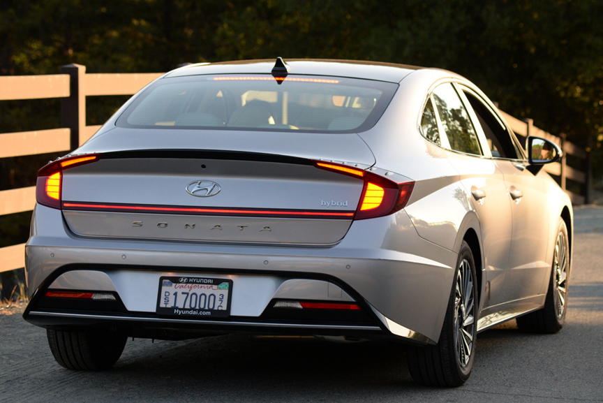 Hyundai stylists have done a remarkable job of making a thirty thousand dollar car look like one that should cost sixty thousand. The one word that best sums up the exterior appearance of the latest Sonata is stunning. Particularly well thought out are the flanks of this sedan. Just below the beltline runs a continuous panel Hyundai calls the Lightning Stripe. This subtle sweep unifies the side view much like those chrome spears Detroit favored back in the Fifties. As if to pay tribute to the Motor City's favorite metal, Hyundai also embedded a thin chrome strip which runs above the beltline all the way from the back of the greenhouse to the top of the grill. In direct contrast to the discordant styling that mars the looks of so many affordable cars, the Hybrid Limited Edition Sonata hits the good looks pitch right out of the park.