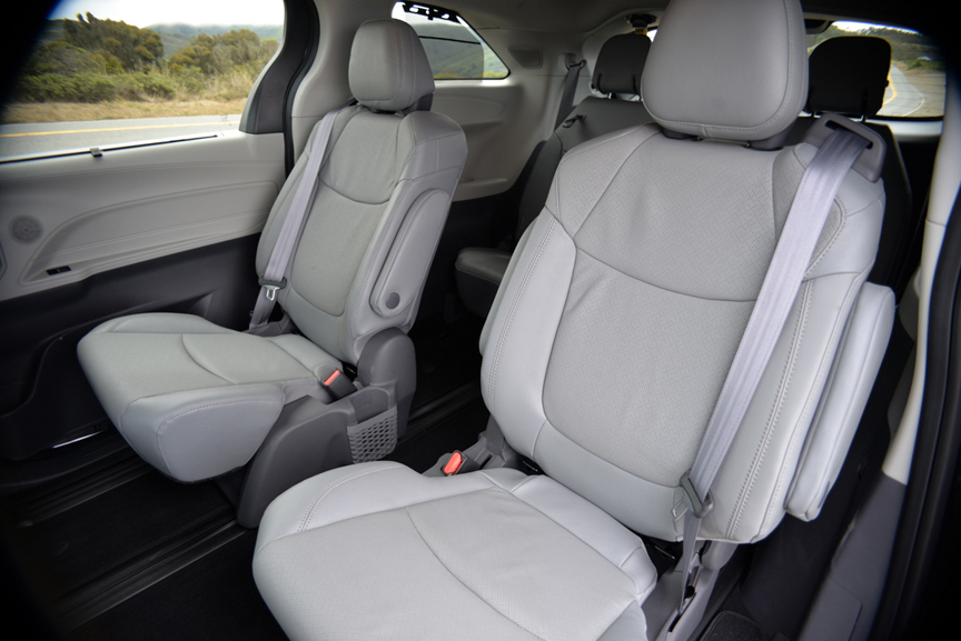 Toyota has done a fine job of upgrading the interior of the new Sienna LTD to look more expensive than the sticker price would seem to justify. We particularly liked the intelligent staging of the instrument panel, center console, dashboard-wide storage shelf, and usable division of door pockets. The subtly striated plastic which covers the huge center console is understated and handsome. Not only is the glovebox spacious, but also fitted with an actual key lock of its own. The metal key slips out of the hand-held remote fob used to lock and unlock the Sienna. The enormous sliding doors on both sides of the van can be operated via an overhead panel above the windshield, or alternately by pressing the appropriate button on the handheld remote.