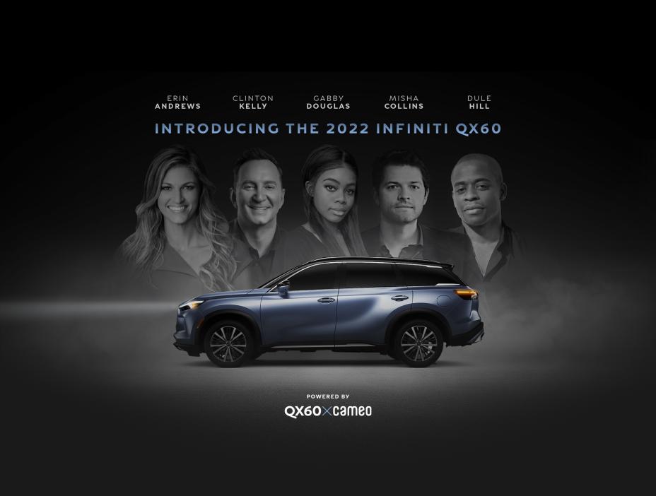 "The all-new 2022 QX60 is among one of our most significant product launches to-date, and this campaign with Cameo is in line with our goal to provide insightful and entertaining resources for our customers," said Phil O'Connor, Director of Marketing Communications, INFINITI Americas. "We are elated to announce this Reservation Program, and work with Cameo's roster of incredible talent. We know our customers value meaningful experiences and believe this platform offers an engaging and informative way to interact with this star SUV."