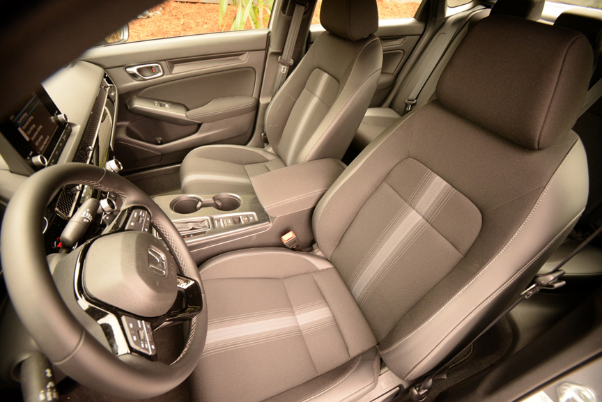 If, however, you are a parent searching for a perfect first car for your offspring, the Sport's rather lackluster straight line performance will be viewed as a plus. It's really hard to get into trouble with this package, especially if you leave the safety nannies in full control as delivered from the factory. And what if you aren't planning on making the new Civic a gift to offspring? Well, it could just be the best new deal in town for you. You will love the size and clarity of the 10.2 inch digital dashboard which houses Civic's first-ever LCD instrument cluster. Honda has added a 7-inch color touchscreen to the peak of the dash, the largest ever offered in the Civic line. We were especially intrigued with the look and operation of the honeycombed dash wide insert which encases the HVAC vents in a novel and handsome way. The interior redo, like the exterior revision, is a winner in both appearance and function.