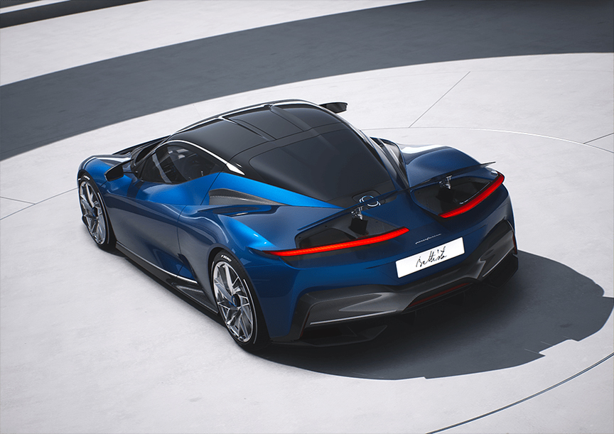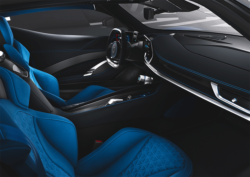 The exposed bodywork and precision polished Impulso forged aluminium alloy wheels are complemented by an exquisitely tailored interior featuring optional Pilota seats finished in sustainable black leather and quilted Iconica Blu Alcantara upholstery, with Iconica Blu contrast stitching, complemented by the Interior Jewellery Pack finished in brushed aluminium anodised in black.