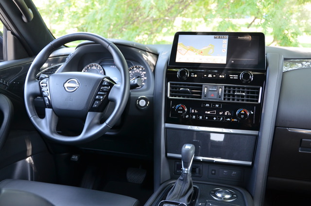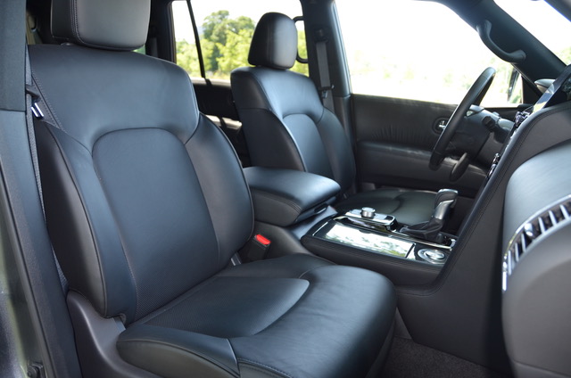 Under the Armada’s hood is a 400-hp 5.6-L V8 engine (a rarity these days) mated to a 7-speed automatic that features Adaptive Shift Control and Downshift Rev Matching. Fuel efficiency is improved through use of its wide gear ratios, automatic transmission fluid warmer and adoption of idle neutral control.