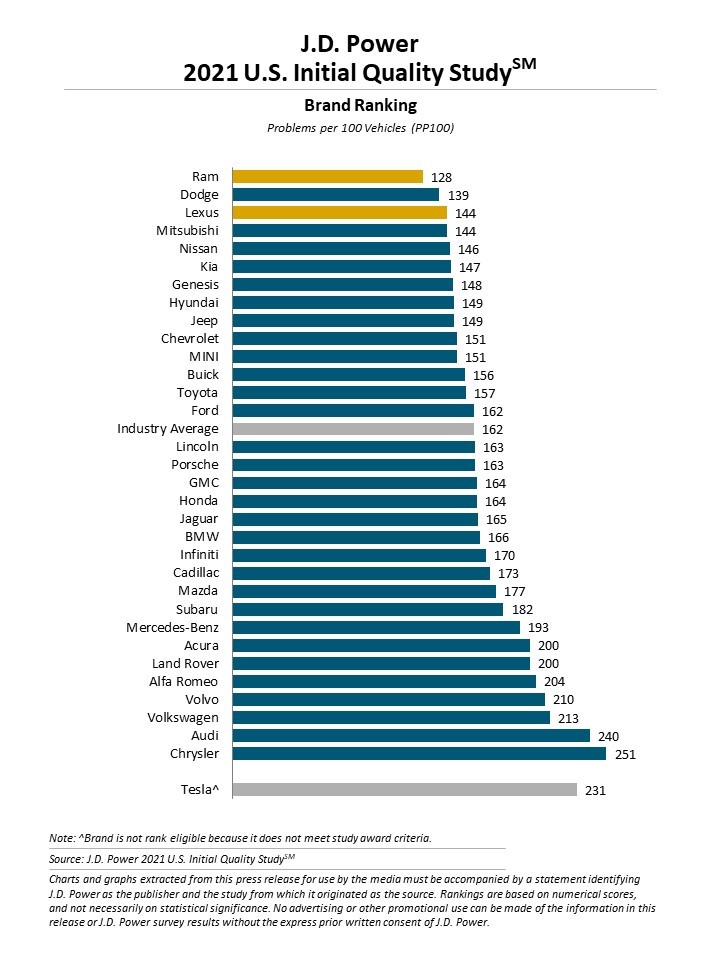2021 JD Power Initial Quality Study: Ram Ranks Highest Overall; Lexus Ranks Highest among Premium Brands