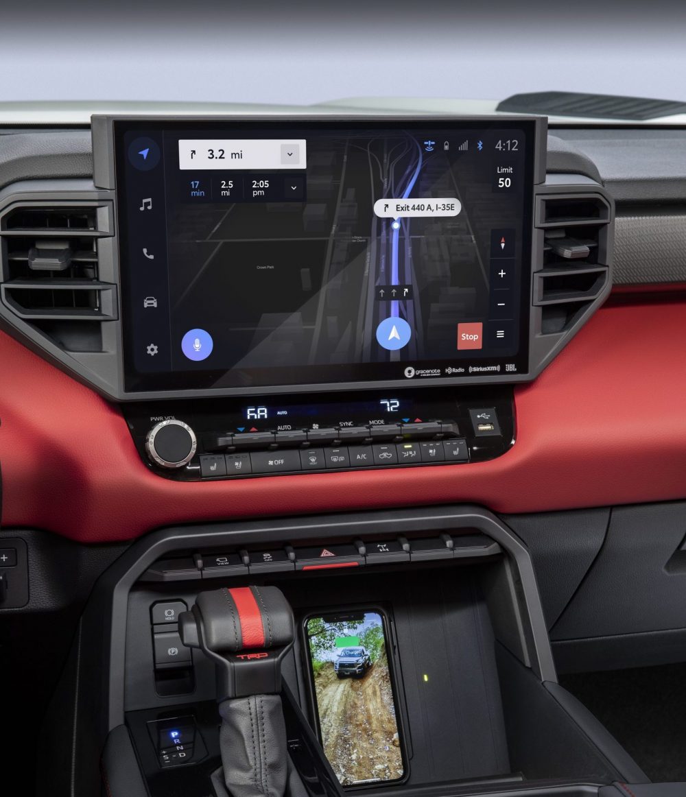 Boasting processing power five times greater than the previous generation system, the latest Toyota Audio Multimedia system features a centrally located standard 8-inch touchscreen or an available 14-inch touchscreen with improved screen resolutions for high-quality, crisp visuals. It also includes more responsive touch functionality that is more familiar to consumers like the pinch and zoom functions we experience on our phones and tablets. Certain to be a favorite among gloved Tundra passengers, the new system still uses a large, easy-to-grip dial for audio volume. The new system also offers standard wireless Apple CarPlay and Android Auto compatibility.
