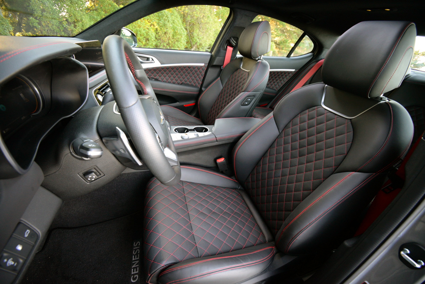 To duplicate this chameleon like behavior, you will need to order your G70 (Base Price $42,700) with two pricey option packages that definitely earn their keep. The first is the Sport Advanced Package ($4,300), which equips the G70 with charcoal 19 inch Sport Alloy Wheels shod with Michelin Primacy Tour A/S radials (225/40ZR10). This option group adds a variable exhaust valve system which produces a pronounced snarl in Sport+ Mode. Cosmetic improvements include genuine aluminum door panel and center console trim. Genesis embosses the aluminum with an engine turned motif that perfectly complements the quilted red stitching of the sports seats. Finally, this four thousand dollar option adds a 15 speaker Lexicon premium audio system, ventilated front seats, wireless device charging, and wide sunroof.