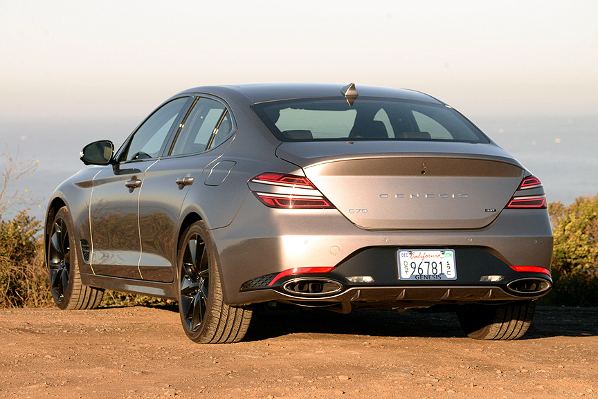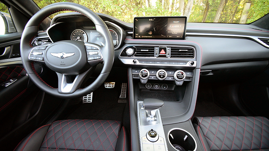 The beauty of this G70 is that you can just as easily dial yourself out of hyper mode and back to something approximating normal street behavior. When you reset the Mode Select knob from boil to simmer, the G70 assumes a velvet demeanor. Road imperfections are smoothed, exhaust noises squelched, and throttle pedal response dialed back from nervous to relaxed. How the same sedan can assume two distinctly different personalities at the twist of a single dial is worthy of psychoanalytic investigation.
