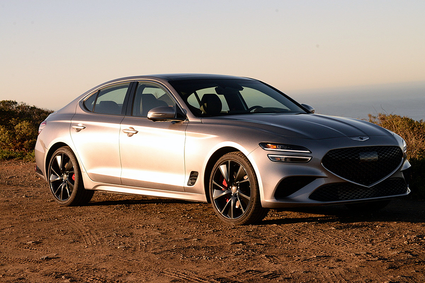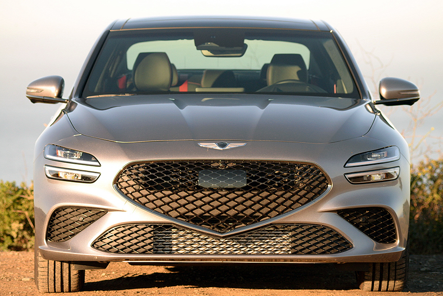 We had an opportunity to drive this Genesis on a night when the moon was full. Even with the extra ambient moonlight, the headlights of the Genesis proved inadequate for fast travel due primarily to their flat cut-off pattern that kept the road directly in front of the car brightly illuminates at the expense of objects in the distance. This effect was compounded by the car's semi-automatic system that over-controlled light beam choice. Aside from this one consideration, however, we found the G70 3.3 liter turbo to be the deal of the 21st century for the enthusiast driver. With its new parabolic exterior styling, exquisite interior, and superlative drive train, the Sport Prestige equipped G70 is a sport sedan twice as good and half as expensive as the vaunted competition from Germany.
