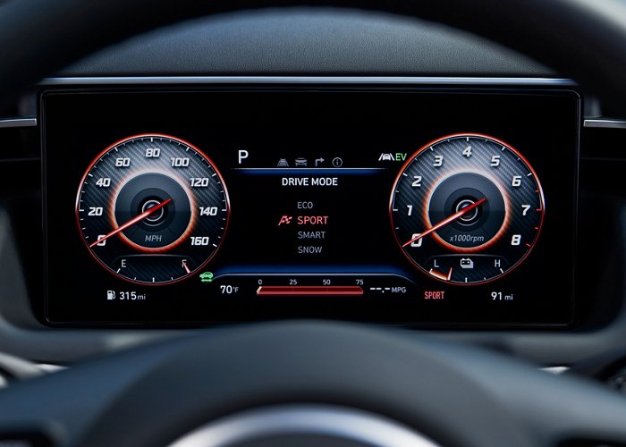 The two engines - a 1.6-liter turbocharged 4-cylinder with 180 horsepower and 195 lb-ft of torque, and an electric motor with 59 horsepower and 195 lb-ft of torque, work together for a combined 227 horsepower and the same 195 lb-ft of torque. The all-wheel-drive system helps grips the road when taking off from standing still, which is very helpful with the delightful immediate response of the electric engine. The feeling of quickness coupled with well-tuned steering and braking make the Tucson a real pleasure to drive in all of its four modes: Normal, Sport, Smart, and Snow.