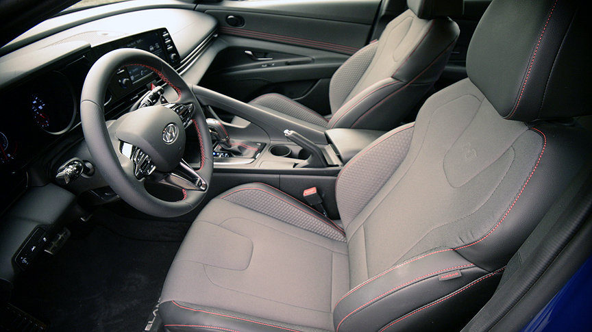 You might assume these changes have converted the Elantra into a stiff riding, uncompromising high performance sedan. You'd be right about the high performance part, but wrong about the ride quality deterioration. In fact, the N Line is one of the most comfortable sedans we've driven in a long time, gliding over bumps and road imperfections with thoroughbred ease. To start your Elantra odyssey, engage "Sport" on the large Drive Mode push button which is intelligently placed directly in your line of vision on the upper dash left of the steering wheel. This setting puts the Elantra on notice that some spirited driving is on the docket. When you tackle a repetitive series of fast S-bends, the chassis hunkers down and allows the excellent Hankook Ventus S1 A/S radials (235/40R18) to get to grips with the pavement. No BMW 3Series, Honda Civic S or VW Jetta GLI will embarrass the N Line on any back road.