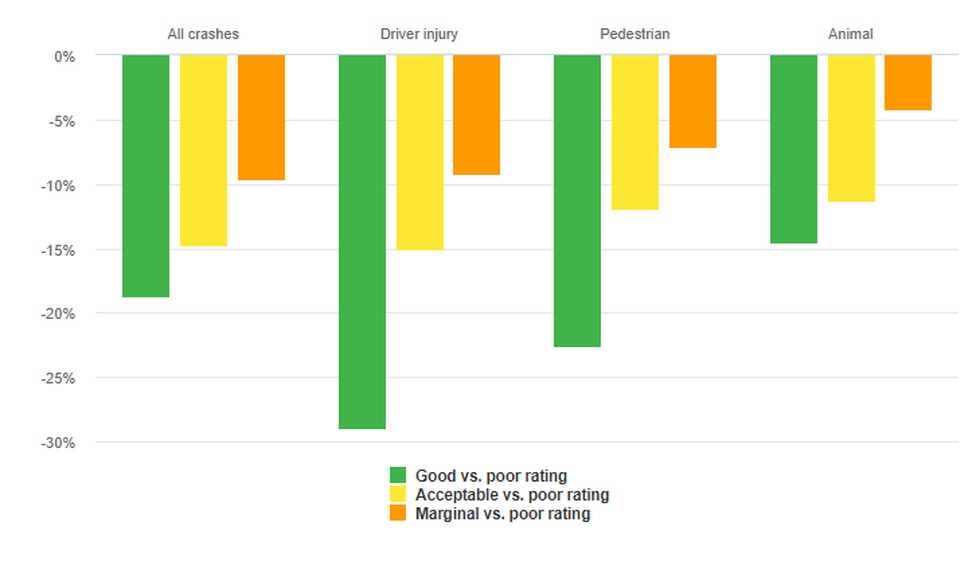 Nighttime crash rates per mile are nearly 20 percent lower for vehicles with headlights that earn a good rating in the IIHS evaluation, compared with those with poor-rated headlights, the study found. For vehicles with acceptable or marginal headlights, crash rates are 15 percent and 10 percent lower than for those with poor ratings.
