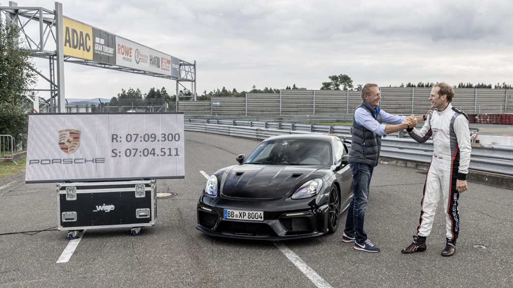 Brand ambassador and development driver Jörg Bergmeister has lapped the 20.832-kilometre Nürburgring-Nordschleife circuit in a lightly disguised production car in 7:09.300 minutes. The 718 Cayman GT4 RS completed the shorter 20.6 km lap, which had previously served as the benchmark, in 7:04.511 minutes – 23.6 seconds faster than its little brother, the 718 Cayman GT4. To protect the driver, the mid-engined sports car was equipped with a racing seat. The tyres fitted to the car were Michelin Pilot Sport Cup 2 R, which will be optionally available. A notary confirmed the standard condition and weight of the car.