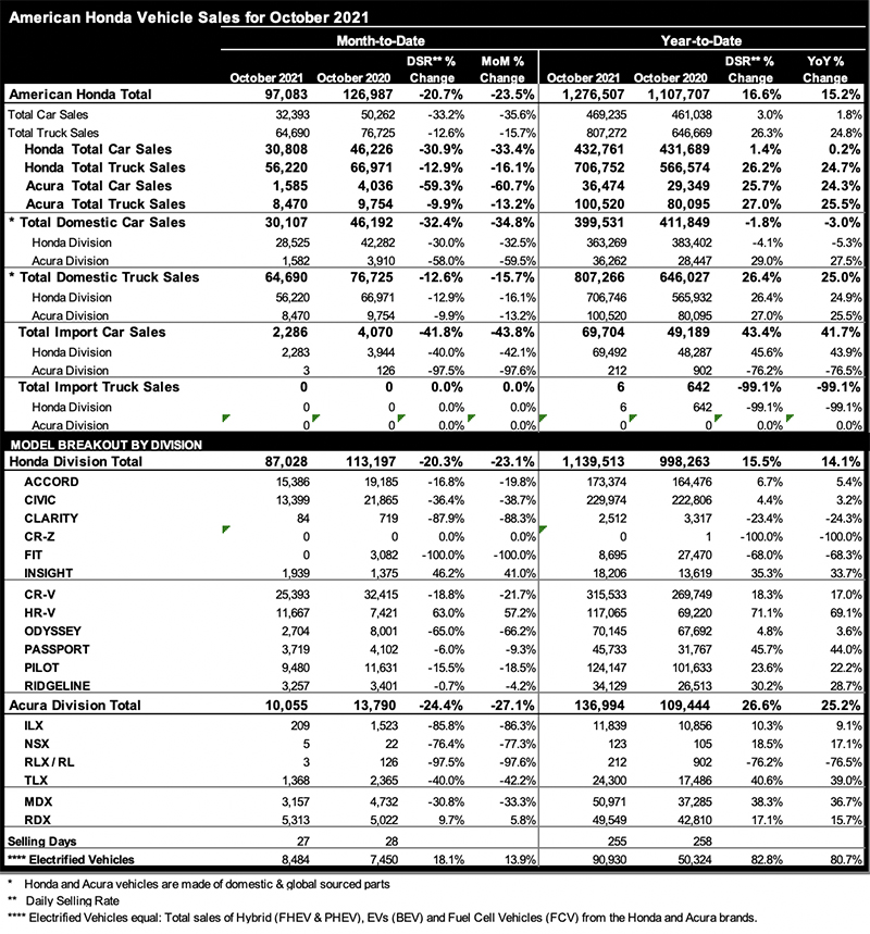 Light Trucks Buffer American Honda October 2021 Sales Through Industry Supply Issues