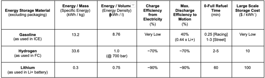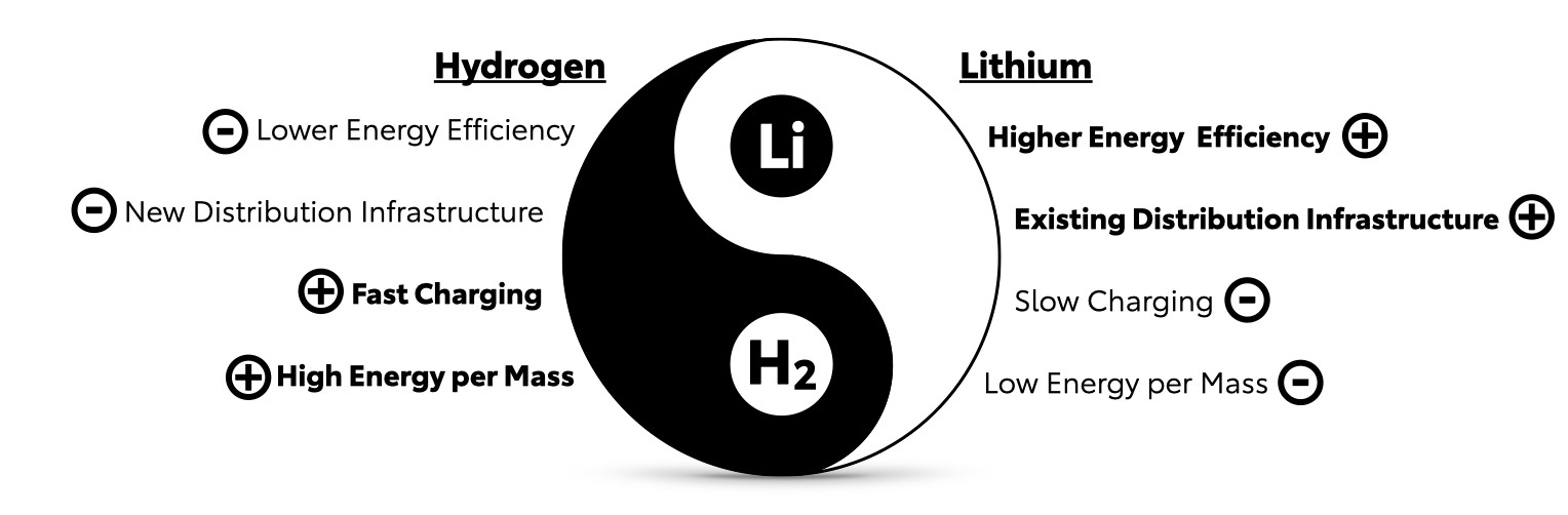 By contrast, Hydrogen, as used in hydrogen fuel cells and engines, has high energy per mass and a high charging rate, but lower energy efficiency and needs new charging infrastructure. In contrast to lithium-ion batteries, hydrogen particularly excels in large vehicles.