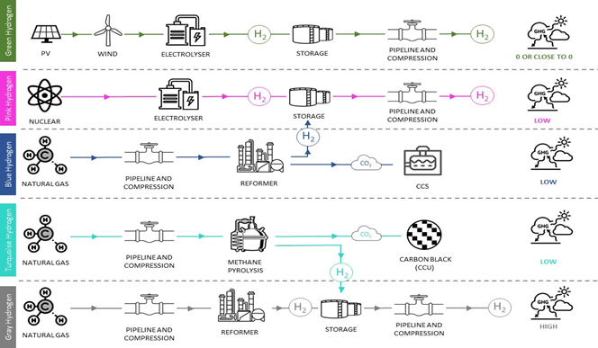 As seen above, much lower carbon methods of generating hydrogen are also being developed, with huge investments from industry, including green hydrogen from renewable power electrolysis of water, pink hydrogen from electrolysis driven by nuclear power, and turquoise hydrogen from high-temperature pyrolysis of methane.