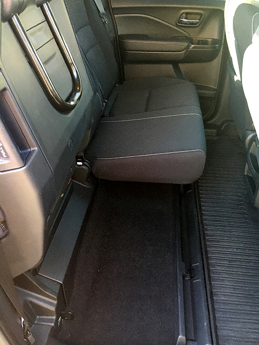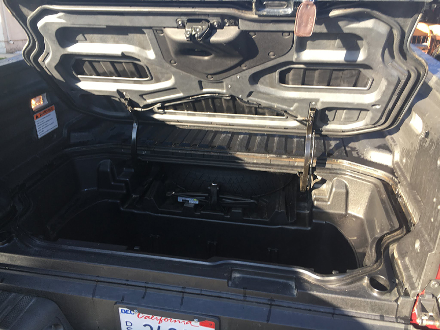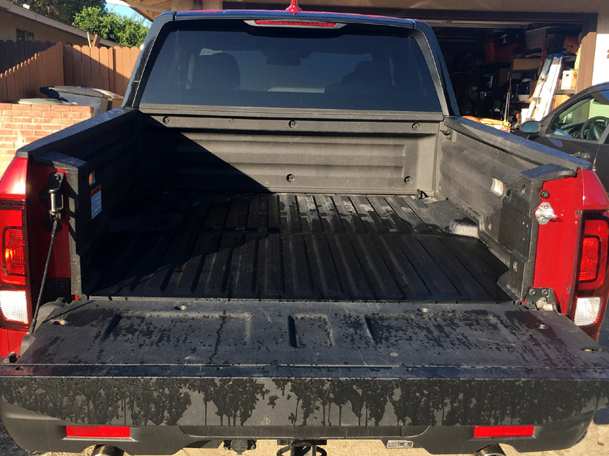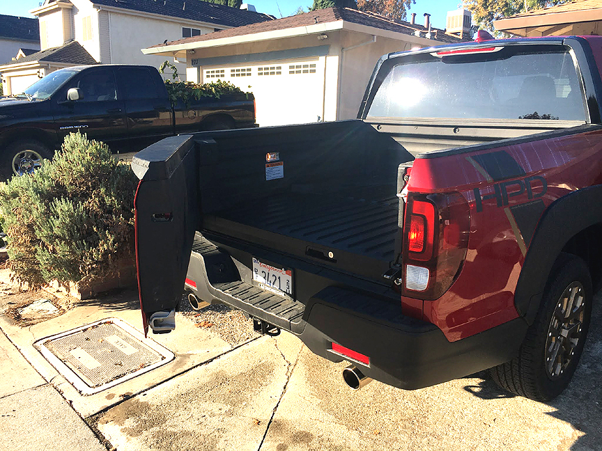 The Ridgeline offers additional storage (7.3 cubic feet and it is lockable) under the rear part of the bed. You could stash many of your power tools in it, or it can be used as a ice chest (there is a drain). The tailgate can be opened either as a normal tailgate (down) or as a door opening on the right side which is how you access the in-bed trunk.