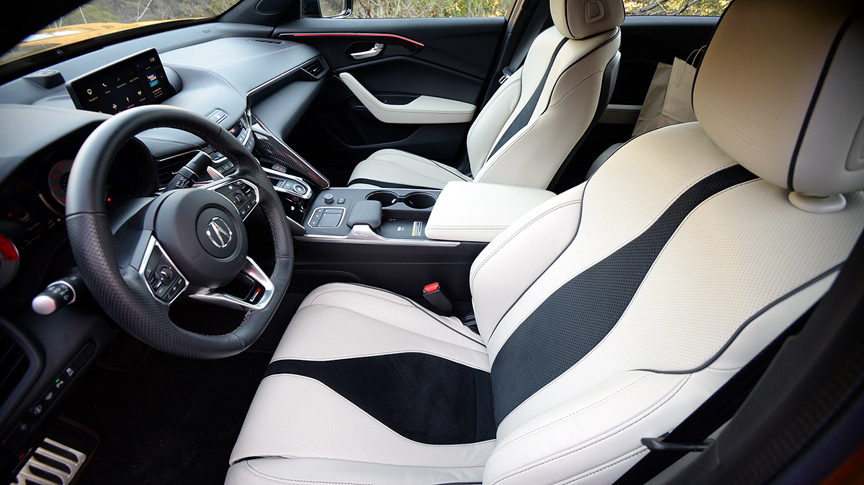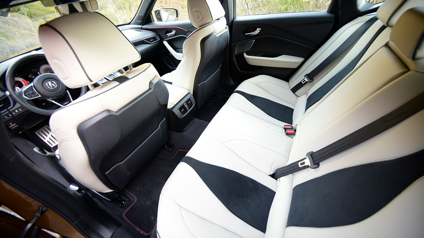 The cockpit treatment of the Type S is visually stunning. Acura has concocted a specially upholstered pair of front sport seats that are heated and handsome. Better yet, they're supportive in all the right places when you're locked into high threshold motoring. Finished in putty with orchid racing stripes, the seats lend visual distinction to an interior that also benefits from tastefully applied swatches of carbon fiber. Instrumentation is distinctive, with oversize silver speedo and tachometer faces featuring dayglow red numbers and pointers. The numerals can be hard to read. Rear seating is tight but comfortable, and interior build quality is impeccable. Although the turbo motor is built in Japan, the Type S is constructed with great care at Acura's final assembly facility in Marysville, Ohio.