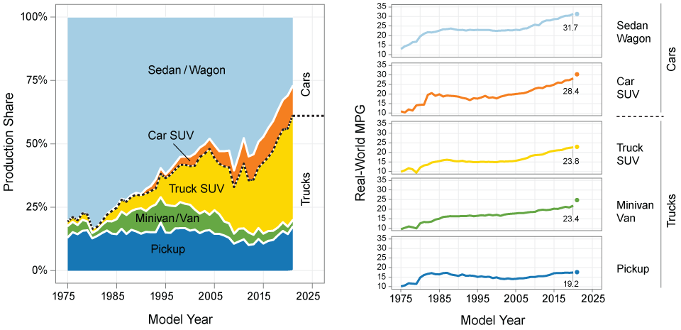 Average Fuel Economy for model year 2020 vehicles increased to a record 25.4 miles per gallon (mpg), 0.5 mpg more than the average for model year 2019. Hybrids, plug-in hybrids, and electric vehicles are poised to grow, but are currently at low adoption levels. Electric and plug-in hybrid vehicles accounted for 2 percent of all production, and hybrids 5 percent. In the projected model year 2021 data, those categories are estimated to grow to 4 percent and 9 percent of all production.