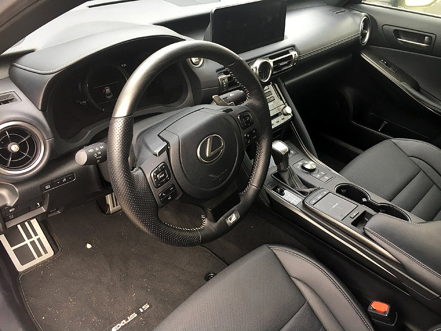 The IS 350 is available in RWD or AWD. The engine is a 3.5-liter V6 that makes 311 hp at 6,600 rpm, and such sweet sounds from about 3,000 up. The transmission is an 8-speed automatic with RWD, and a 6-speed with AWD; the test IS 350 was RWD. There is no manual transmission available. Personally I no longer see the need for shifting on my own; today's automatics are so good - and they usually have a manual mode - that manual transmissions really offer no advantage. Suspension is independent all around; brakes 4-wheel disc. Wheels on the test F Sport are 19" with 235/40R19 on front, and 265/35R19 in the rear. Yes the tires are aggressive and a bit harsh due to the short sidewalls but this is a sport sedan.