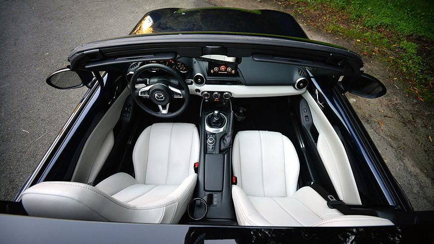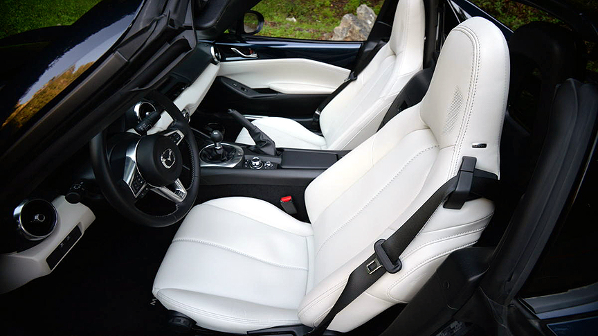 You can equip your Miata with several levels of trim, starting with the fabric roofed Club Model which starts at $33,045. This version includes a Bose 9-speaker audio system, 17 inch alloy wheels, and black front and rear spoilers. The Grand Touring RF model we tested starts at $34,525. In addition to the retractable roof, the GT adds an adaptive front lighting system, heated leather trimmed seats, and the Mazda Navigation System. The only additional charge was $300 for striking white Nappa leather seats. The GT kit also upgrades suspension with sport tuned spring and anti-roll bar rates controlled by Bilstein shock absorbers at each corner. The 17 inch alloy rims are fitted with track-worthy Bridgestone Potenza S001 radials (205/45R17) that get a ferocious grip on the pavement.