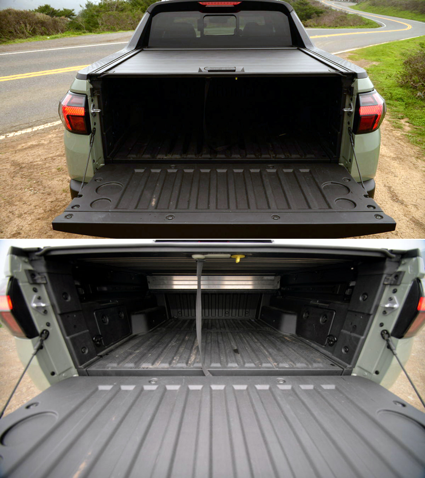 The ingenuity award goes to Hyundai for the roll-up bed cover that hides the 52"(L) x 42"(W) open box of the new Santa Cruz mini pickup. First, you drop the hydraulic tailgate. Then activate a trigger-like release mounted atop the segmented bed cover. The cover magically slides open and stores itself in an aluminum canister mounted beneath the rear cab window. Retrieve it with the provided lanyard. This device has just got to be the best invention since Henry Ford replaced the Model T's trunk with an open box and called it a truck.