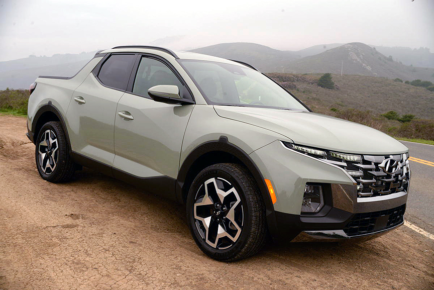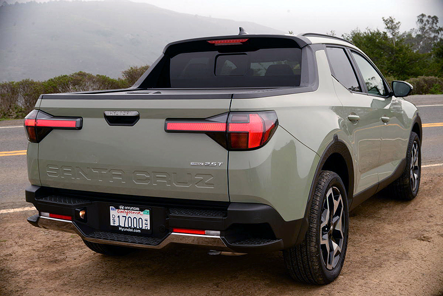 Hyundai has selected a flat expanse of obsidian glass and plastic to control almost all HVAC, infotainment and navigation inputs. This is unfortunate, but at least the seat heaters have their own button. Most of all, we missed a simple volume control knob, though a switch on the left spoke of the steering wheel suffices for driver control of sound level. Stylistically, the attractive flip-ups of the sheet metal on the rear doors look great, but reduce your view out the side windows. This makes parking a blind proposition. Finally, the AWD system saddles the Santa Cruz with a vast turning radius that makes U-Turns two-cut propositions on any street. Aside from those modest complaints, the Santa Cruz Limited wins our vote as the best new combo concept for 2022.