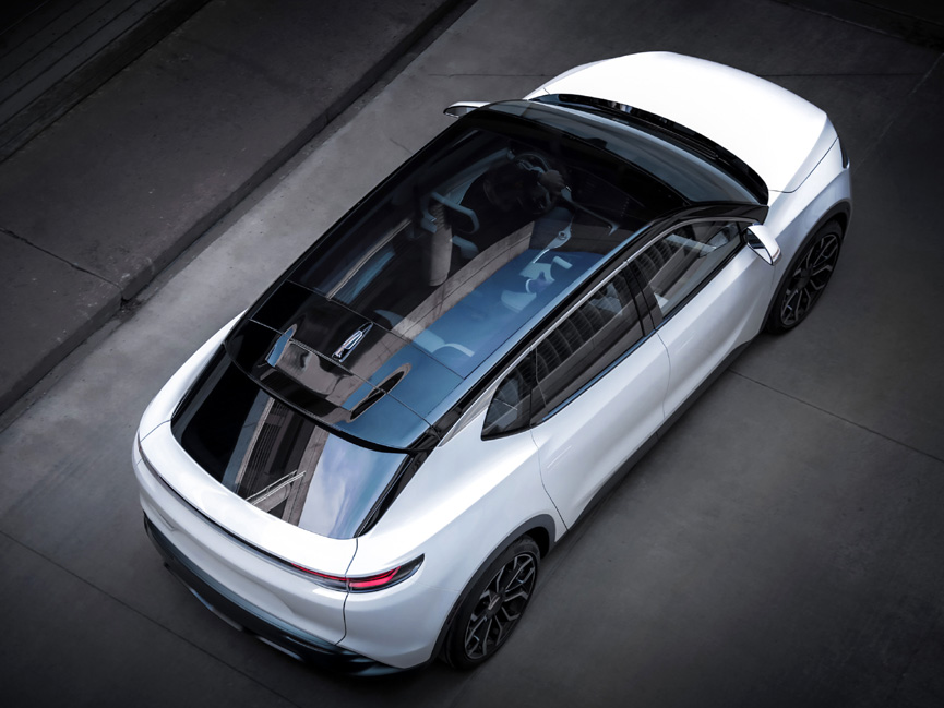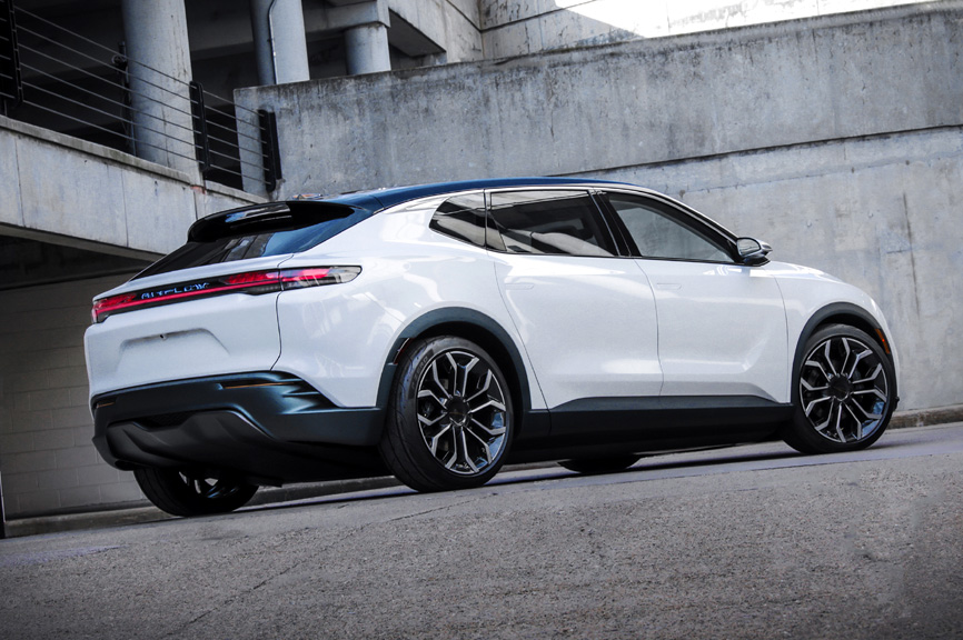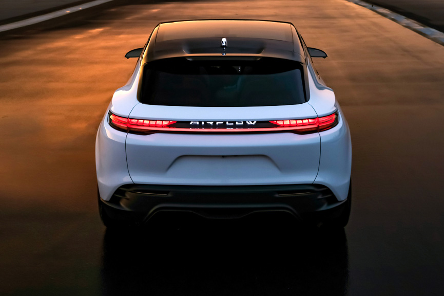The Airflow Concept features a dynamic design proportion, with a low ride height and streamlined, two-tone roof line that achieves an elegant yet athletic profile while increasing EV range. A long wheelbase and wide track, along with large 22-inch wheels and tires, are enhanced visually with Celestial Blue accent color cladding. The design elements work together to enable a dramatic stance and deliver excellent handling and performance dynamics.