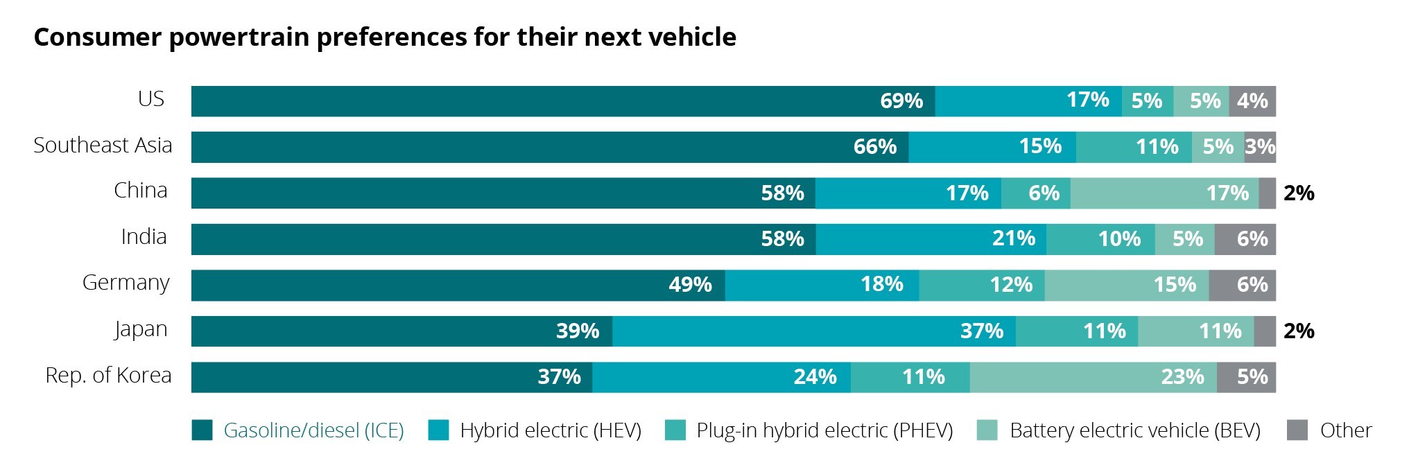 - As a result, ICE vehicles continue to dominate future U.S. vehicle purchase intentions (69%). Among alternative powertrains, consumer interest in battery electric vehicles (BEVs) is highest in the Republic of Korea (23%), China (17%) and Germany (15%), while Japanese consumers showed the highest preference towards hybrid electric vehicles (HEV/PHEV) (48%) followed by the Republic of Korea (35%).