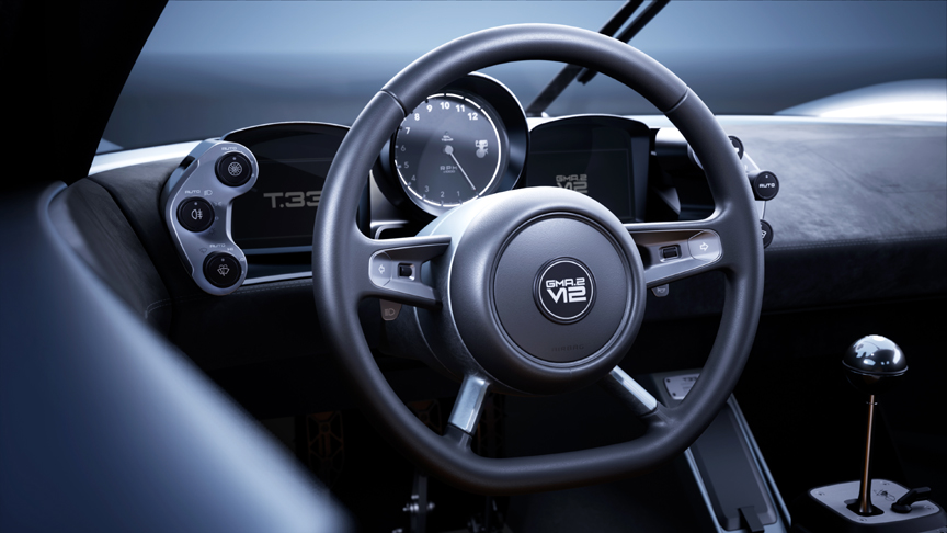 Professor Gordon Murray CBE: “Our focus from day one of this project has been to deliver absolute driving perfection. And while the engine may be the heart and soul of a supercar, the cabin and its controls provide the conduit through which the driver engages with the engine and the car’s other attributes. The T.33’s driver-focussed cabin enables each journey, no matter how short, to be relished free of distraction and it also provides the practicality for longer trips to be undertaken.”