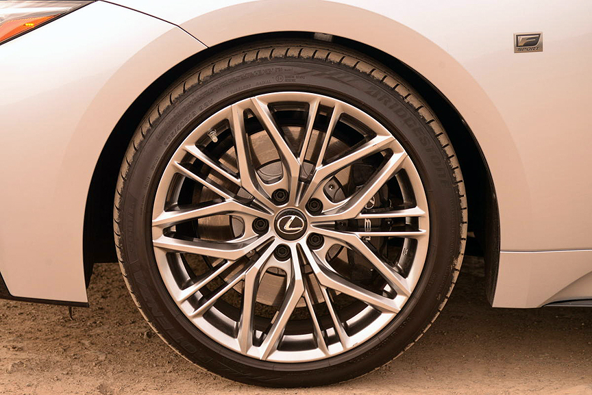 Adaptive Variable Suspension is standard on the IS 500, with a quintet of suspension/shift/throttle settings available. Driver selectable Drive Modes are accessed via a large knurled knob on the central console. These offerings include Eco, Normal, Sport, Sport+ and Custom. We left the Mode in Normal for freeway work, but dialed up Sport+ when we were ready to tackle some back road challenges. Turn-in is exceptionally quick, with the beefy Bridgestones taking a decisive initial bite as you hone in on your corner apex. Flatten the throttle on exit, and the rear gives a quick twitch as it copes with the full infusion of 395lb.-ft. of torque.