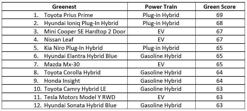 As a result, energy-efficient gasoline hybrids account for five of the greenest cars—up from only two last year. They include Honda's Insight, two by Hyundai (Elantra Blue and Sonata Blue), and two by Toyota (Camry LE and Corolla). The other seven greenest cars are plug-in hybrid vehicles, including the #1 scoring Toyota Prius Prime, which reclaims the spot it held in 2020, and #2 Hyundai Ioniq, or all-electric cars such as the Mini Cooper SE Hardtop 2-door (#3) and the Nissan Leaf (#4).