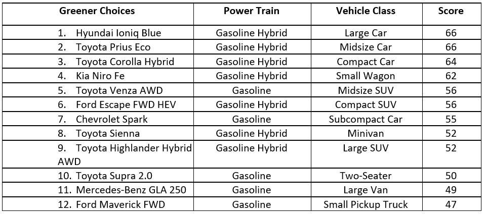 No pure internal combustion engine vehicles made the Greenest List. Yet the list does include five gasoline hybrids, which combine a small gasoline engine with an efficient electric motor (and capture the energy from braking in the battery) to improve the vehicle’s overall efficiency. This is a good indication that even a small degree of electrification can greatly improve fuel economy.
