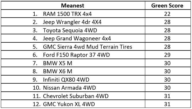 GreenerCars.org also provides a Meanest List, as usual made up this year of gasoline-fueled large SUVs, pickup trucks, and European luxury cars that are the least friendly to the environment. The RAM 1500 TRX 4x4 takes the first (“meanest”) position again this year, with the rest of the list mostly populated by regulars from prior years.
