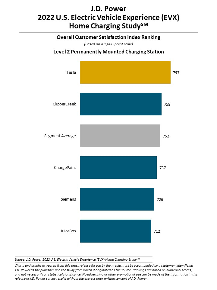 TROY, Mich.--(BUSINESS WIRE)--With sales of battery electric vehicles (BEV)1 expected to increase in the coming years, a brighter spotlight also will shine on home chargers. At present, satisfaction is highest among electric vehicle (EV) owners for Level 2 portable chargers and Level 2 permanently mounted home chargers, each garnering overall satisfaction scores of 752 (on a 1,000-point scale), according to the J.D. Power 2022 U.S. Electric Vehicle Experience (EVX) Home Charging Study,SM released today.