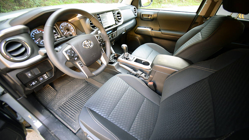The big news for 2022 Toyota truck enthusiasts is the availability of the Trail Edition (TE) package on the mid-range SR5 Tacoma for $3,765 extra. This upgrade to the $36,6555 SR5 V6 starts with a handsome set of 16 x 7J bronze alloy wheels mounting 265/70R16 Goodyear Wrangler rubber. To improve off road clearance angles, the TE loses its front spoiler and adds a skid plate to protect the underside of the engine. For extra ground clearance, Toyota uses taller springs to lift the front suspension 1.1 inches, and adds a spacer to the rear suspension to increase aft ride height by 0.5 inches. These modifications mean you'll ride tall in the saddle. If your legs are short, you will exit the SR5 with a slide and a slight jump to the ground.