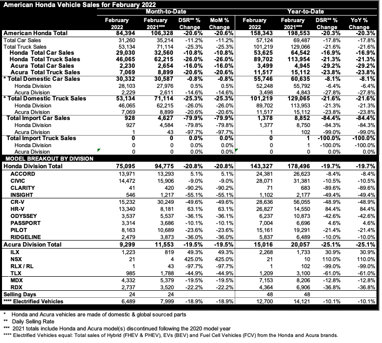 Supply Issues and Winter Storm Landon Constrain American Honda February Sales Momentum