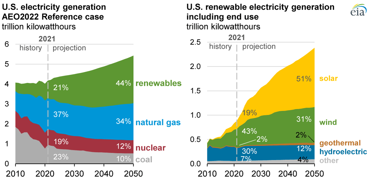 In our Annual Energy Outlook 2022 (AEO2022) Reference case, which reflects current laws and regulations, we project that the share of U.S. power generation from renewables will increase from 21% in 2021 to 44% in 2050. This increase in renewable energy mainly consists of new wind and solar power. The contribution of hydropower remains largely unchanged through 2050, and other renewable sources of power generation, such as geothermal and biomass, collectively remain less than 3% of total generation.