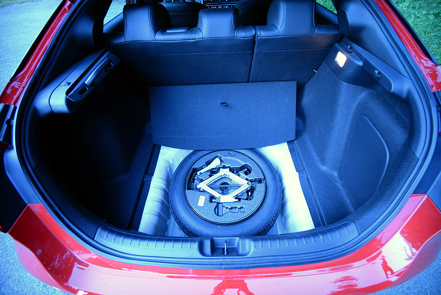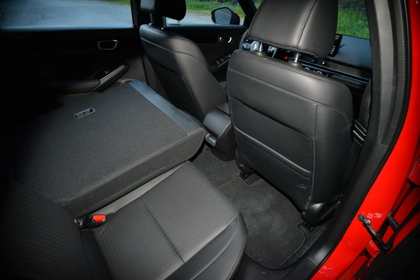 The Sport Touring model tops the Civic range, with a dizzying array of standard features. The most notable improvement is the interior presentation of Gen 11. For starters, it's 1.4 inch wheelbase stretch allows more comfortable rear seating. The beauty of choosing the Sport Touring hatchback model we tested is the deceptively large storage compartment that presents itself when you easily flip down the 60/40 split rear seatbacks. A quick measure of the length of my 63 inch long mountain bike indicated that it might just fit inside the Civic. Sure enough, it nestled tightly inside the Honda. The intelligent packaging is augmented by an innovation I hadn't seen before: a slide-out cover fixed to just one side of the rear space. It can be pulled out of its receptacle and attached to the other side to hide your items. This design alleviates the need for the typical spring loaded center bar/cover that always manages to interfere with loading and thus needs to be removed.