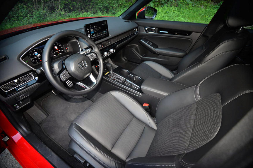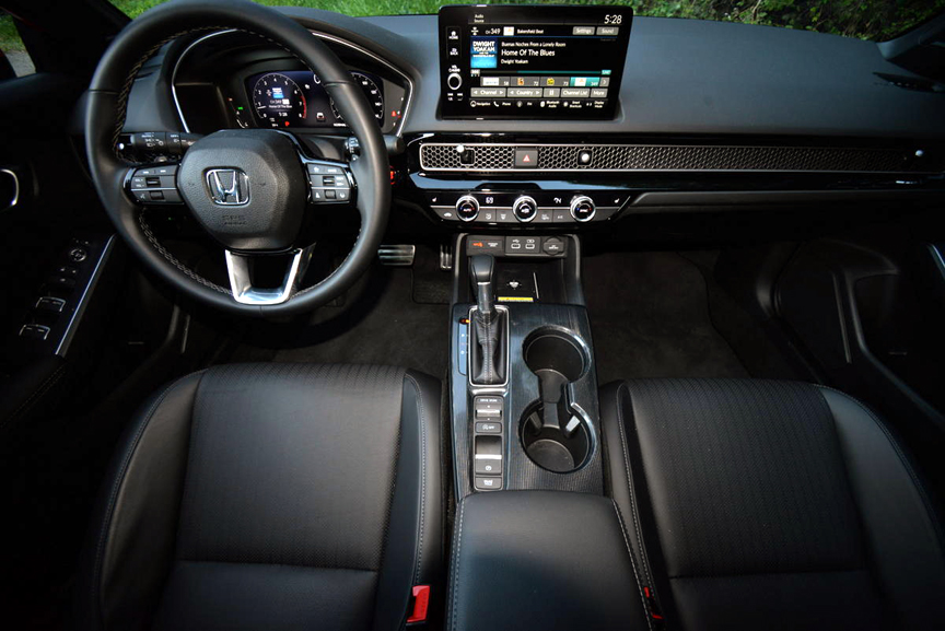The upgraded interior accoutrements continue up front, where Honda has done a masterful job of integrating a 9 inch touchscreen into a simplified dash face. The screen is easy to operate, and the ventilation outlets splayed below it are artfully camouflaged with lattice grill openings that look elegant and work well. Honda provides the Civic with a complete portfolio of Honda Sensing nannies, including Collision Mitigation Braking, Lane Keeping Assist and Road Departure Mitigation. If you enjoy driving to an accompaniment of constant beeps, buzzes and steering wheel interventions, then by all means leave these systems engaged. However, I was pleased to discover just how easy it is to disable them with a few programming swipes, and spent the rest of my week with the Civic blissfully uninformed by any aids other than those my eyes and ears provided.