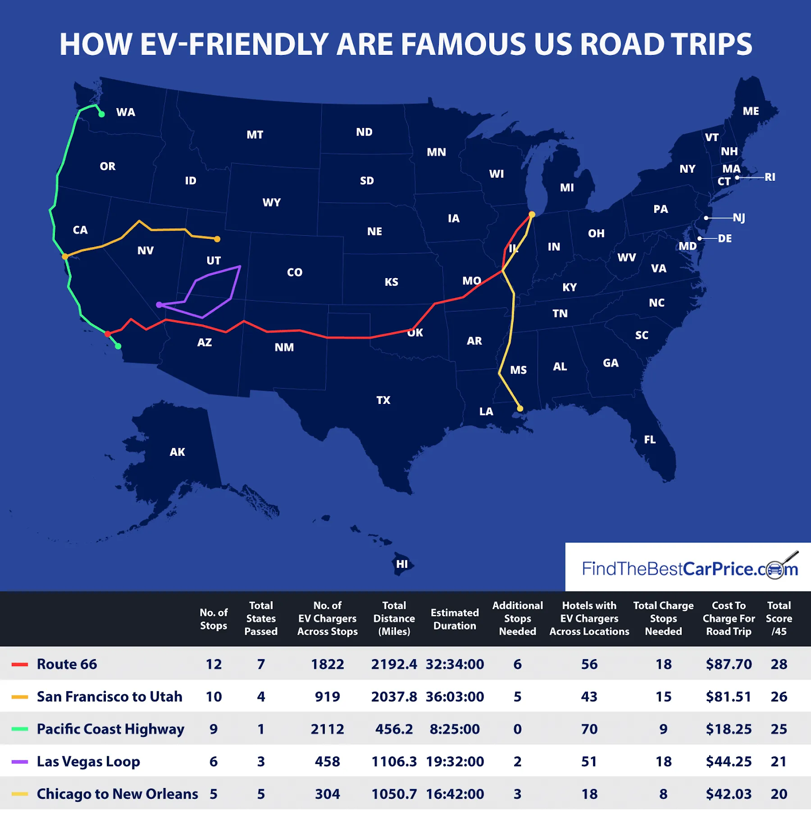 FindTheBestCarPrice.com explored five popular road trips in the United States and their recommended stops along the way for each trip, the distance between them, how many EV charging stations each stop has, and how many hotels with EV chargers each stop has.