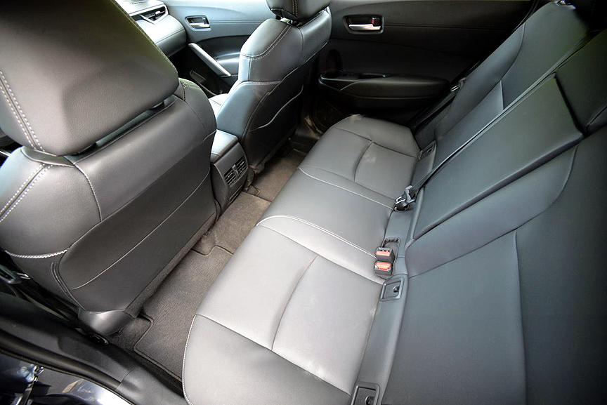 A constant velocity transmission (CVT) connects the engine to the all-wheel drive train, and offers a manual gate for drivers hoping to extract the last bit of urge from the hard-pressed engine. However, manual manipulation of the CVT does little beyond increasing the interior noise level. Thankfully, Toyota is planning to supplement the Cross portfolio with a hybrid slated for introduction in 2023. Until release 2.0 arrives, you can content yourself with enjoying the current Cross' infotainment and connectivity offerings. Like the Corolla sedans, the base Cross offers a 7-inch dash-top screen, enlarged to 8 inches on the XLE. Programming your favorites is exceptionally easy, and with a 3 month free Platinum level subscription to SiriusXM satellite, you will have more than 350 channels to amuse yourself. Apple CarPlay and Android Auto are standard, and the XLE gets a wireless phone charger. The XLE's spacious back seat is fitted with a drop down center cup holder/armrest, as well as two USB charging ports.