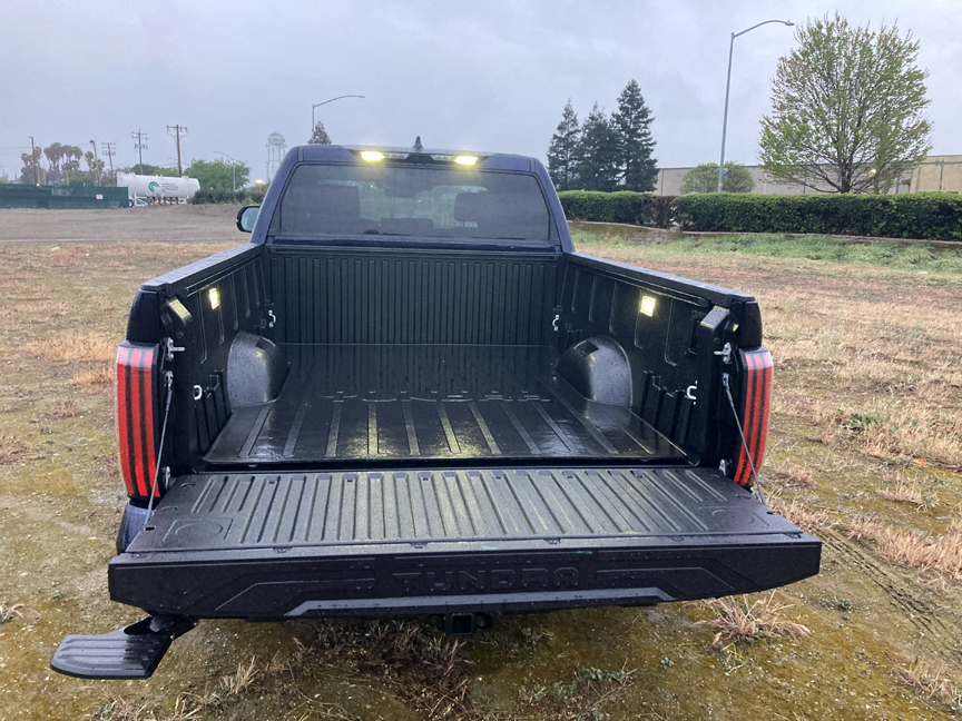 I am always amazed at the utility of modern pickup beds. It used to be the bed was an empty box to be filled with all kinds of stuff. Now it's almost an extension of your home workshop. The test Tundra was fairly basic by today's norms; LED lights, tie-downs, and a 120V/400W AC outlet.