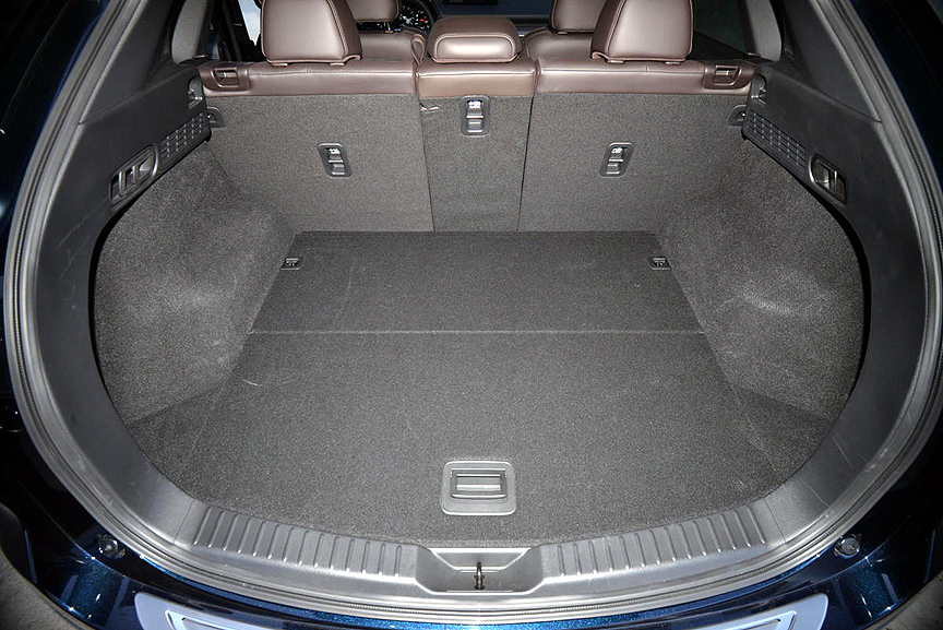 With some subtle re-contouring of the external surface, the previously awkward styling of the CX-5 is gone for good. The grill gains a textured insert, the panel below it is now finished in body color, the headlight nacelles are better integrated into the fenders than before, and the previously unfinished plastic arches over the wheel openings are now painted body color. Mazda pays no heed to the current industry-wide styling mandate that dictates all top line models must roll on black alloy wheels. In fact, the Signature CX-5 abolishes that norm with its brilliantly chiseled set of 19 inch "Bright Alloy Wheels." These sparklers looked particularly good when set against the "Deep Crystal Blue Mica" finish of our test car. With 8 inches of width, they staunchly support the Toyo A36 225/55R19 all-season radials that insure the CX-5 will cling to both pavement and broken terrain with equal diligence.